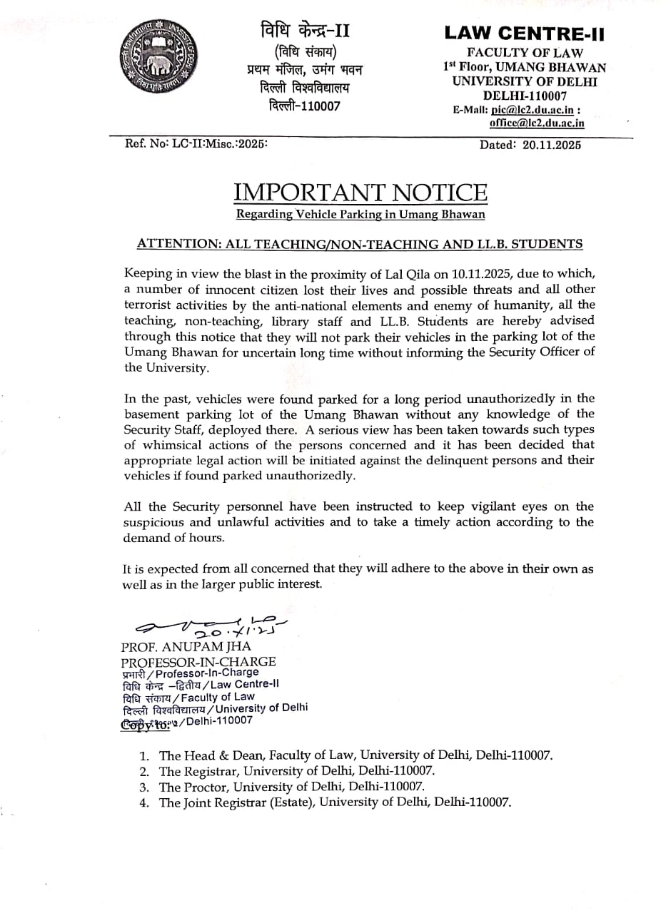 - Important Notice regarding Vehicle Parking in Umang Bhawan