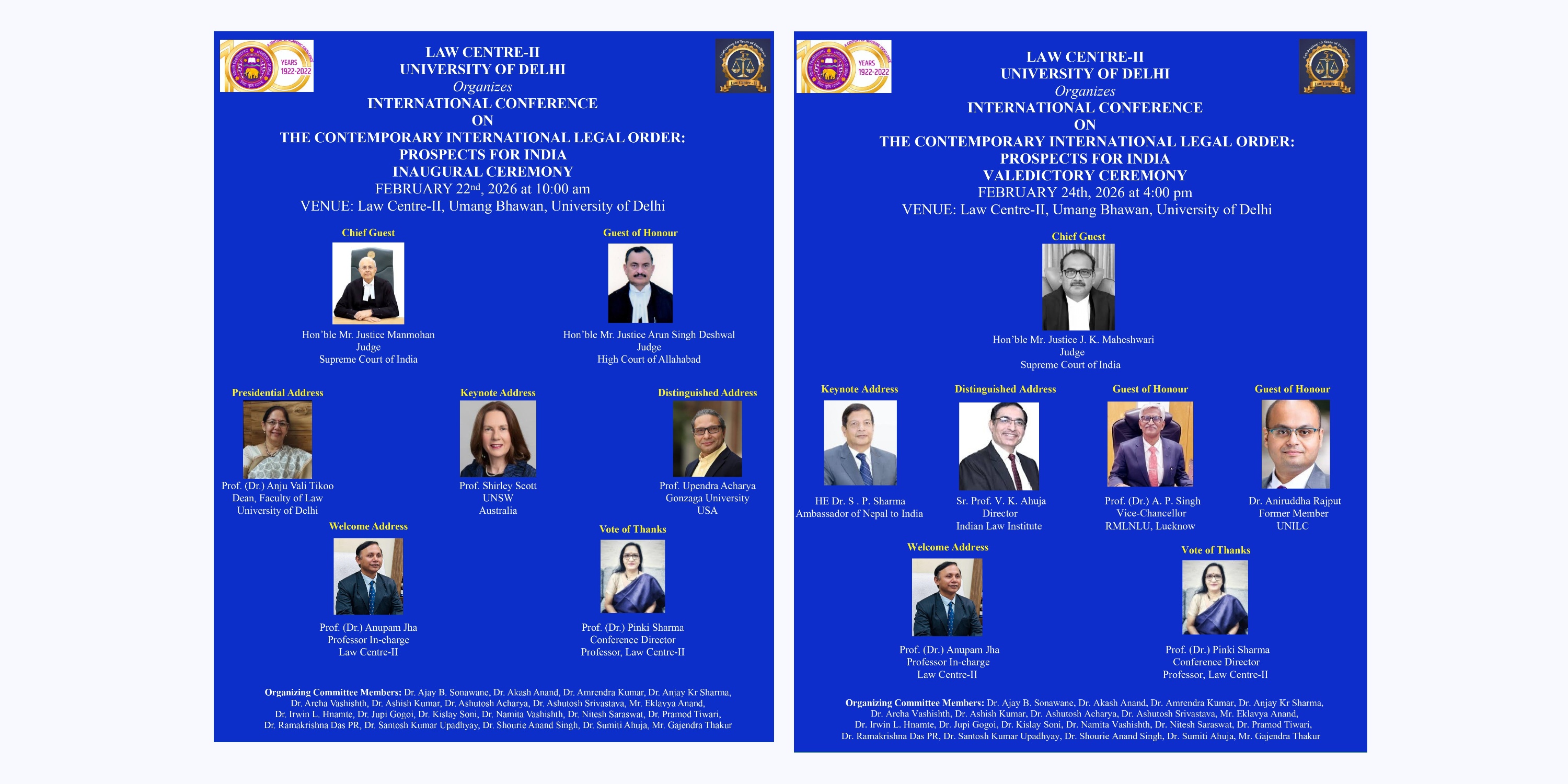 Law Centre-II made a humble beginning in the year 1971 at the premises of ARSD College, Dhaula Kuan to offer full-time LL.B. program. It has a glorious past of 54 years. The LL.B. classes were conducted in the evening and the alumni of Law Centre-II included top bureaucrats, police officers, military officers, teachers from different departments, chartered accountants, doctors, engineers, and other professionals. The Centre had the privilege of being headed by the top law scholars of India, such as Prof. Upendra Baxi, a well-known jurist and former Vice-Chancellor of University of Delhi; Prof. Tahir Mahmood, who subsequently became Chairperson, Minority Commission, Prof. A.K. Koul, who was elevated as Vice-Chancellor, National Law University, Jodhpur and National Law University, Ranchi, Prof. Gurdip Singh, who became Vice-Chancellor, National Law University, Lucknow, Prof. Poonam Saxena, was Vice-Chancellor, National Law University, Jodhpur and Prof. B.T. Kaul was Chairperson, Delhi Judicial Academy