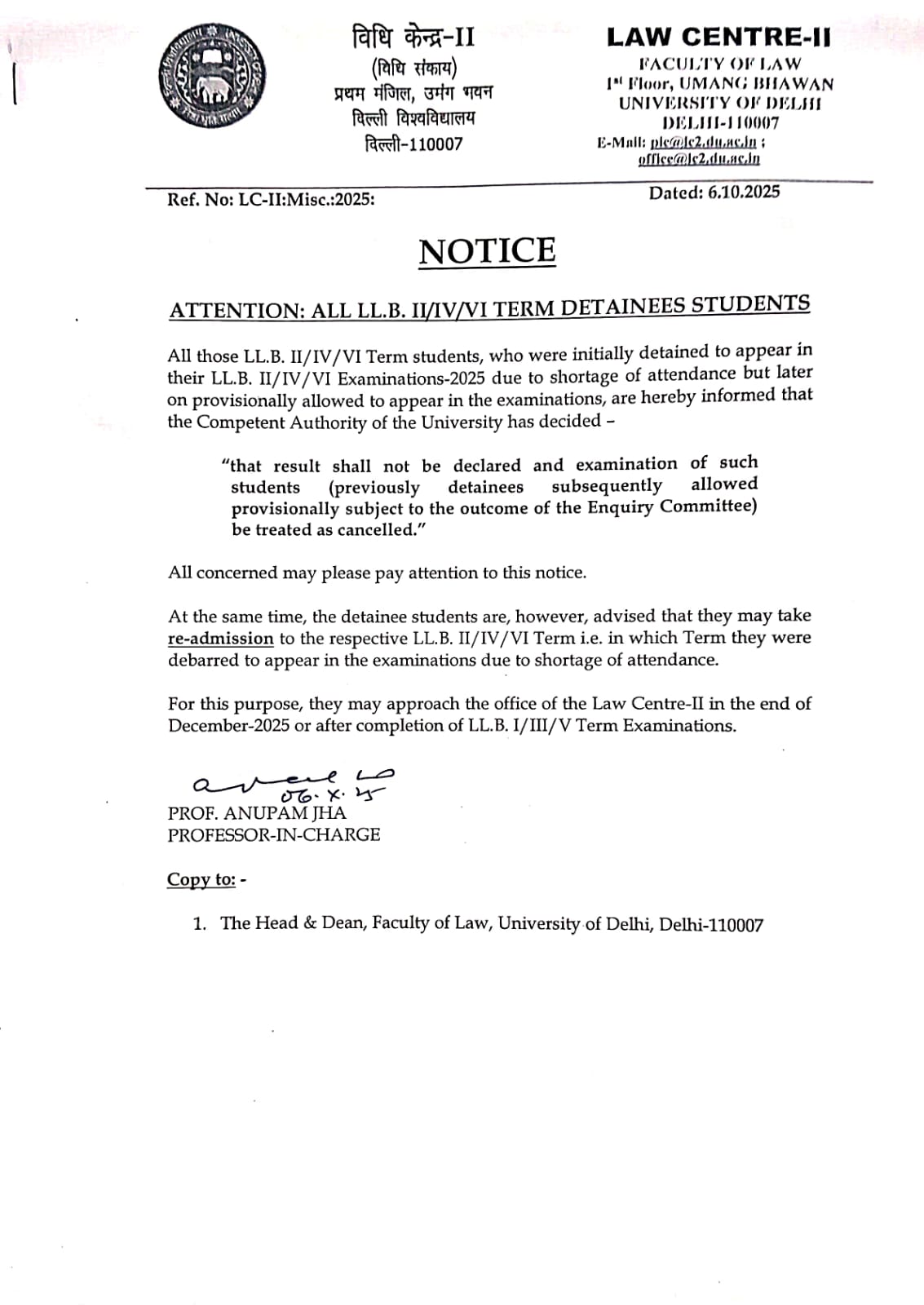 - Notice regarding Orientation Programme of Legal Aid Society, Law Centre-II