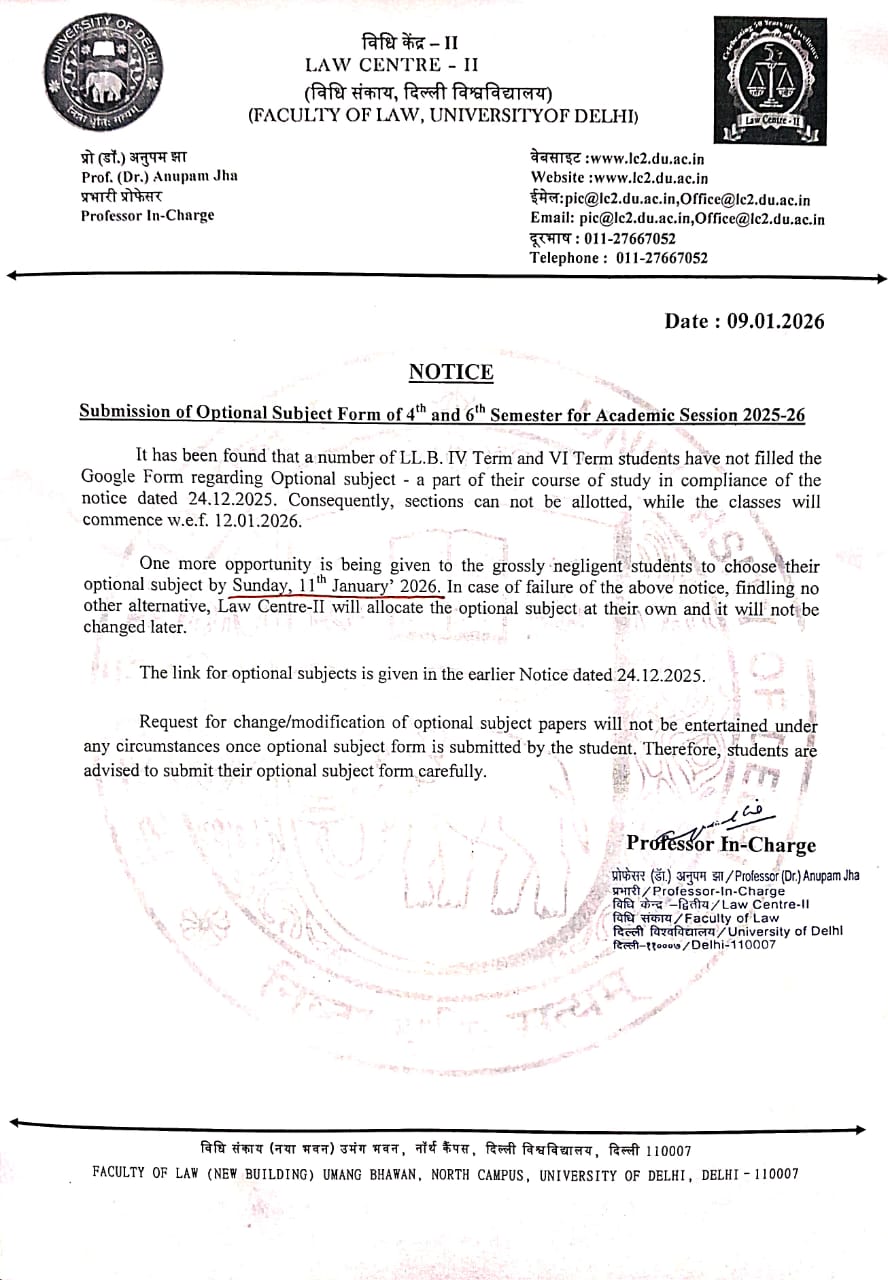 - Notice regarding Students for Various Posts/Executive Members Legal Aid Society - Law Centre-II